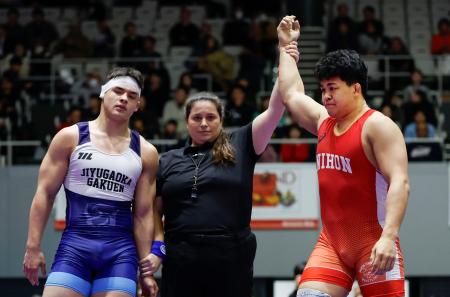 男子フリー97キロ級でリボウィッツ和青(左)を破り、優勝した吉田アラシ=駒沢体育館