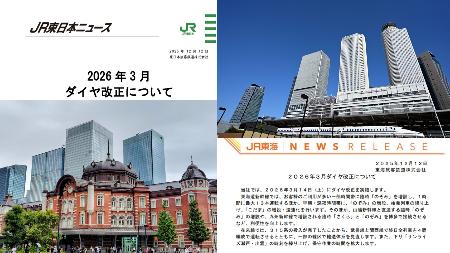 JR東日本、JR東海が発表した2026年春のダイヤ改正資料。写真は東京駅(左下)と名古屋駅(右上)で、いずれもphotoAC提供
