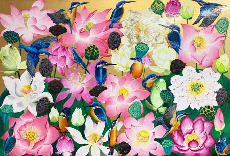 大場多知子「蓮と翡翠」(2022年 アクリル、キャンバス)(提供写真)