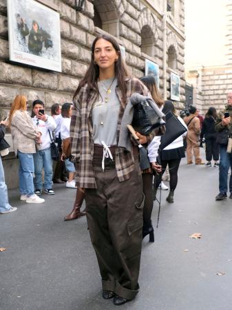 ネルシャツとオーバーサイズのパンツを合わせたアメカジスタイル=2024年9月