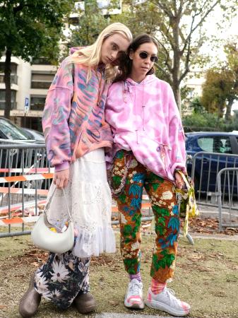 カラフルなパーカーのカップル。白いスカートの重ね着が似合う男性(左)=2021年10月