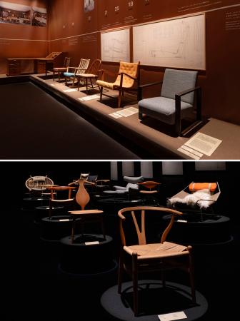 渋谷のヒカリエホールに並ぶハンス・ウェグナーさんの(右から)「ファーストチェア」「セカンドチェア」(上)、「Yチェア」(手前)など代表作の数々(下)(photo:Yuya Furukawa)(提供写真)