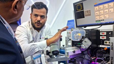 「セミコン・インディア2025」で、半導体の製造装置を展示した地場財閥タタ・グループのブース=2日