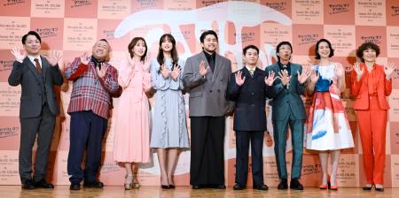 制作発表会見に登場した(左から)小貫流星、脇知弘、妃海風、山崎紘菜、井口理、矢本悠馬、小松和重、まりあ、明星真由美=東京都港区