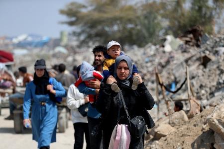 ガザ北部ベイトハヌーンでイスラエル軍の攻撃から避難するパレスチナ人ら=3月(ゲッティ=共同)