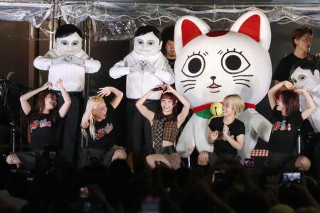 アニメ「ダンダダン」のキャラクターと登場したアイナ・ジ・エンド(中央)=5日、東京都新宿区