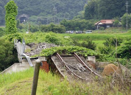 全線運休が続くJR美祢線の線路=6月、山口県美祢市