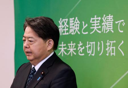 山口県で開かれた総決起大会に、オンラインで参加する林官房長官=28日午後、国会
