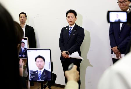 記者団の取材に応じ、自民党総裁選の配信動画へのコメント投稿問題について答えた小泉農相=27日、東京都港区