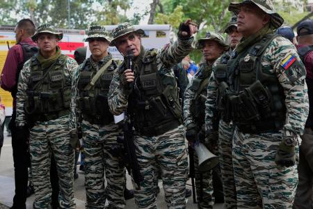 軍事演習で話すベネズエラのパドリノ国防相=20日、カラカス(AP=共同)