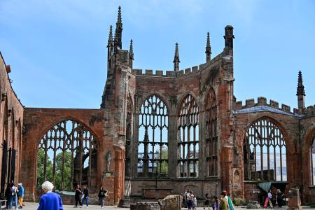 第2次大戦中にドイツ軍の空襲で焼け落ちたかつての大聖堂=8月、英中部コベントリー(共同)