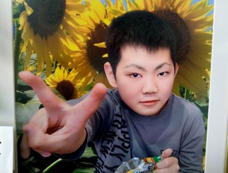 久保田大治郎さんの遺影を見つめる母真実さん(右)と父純司さん=8月、東京都八王子市