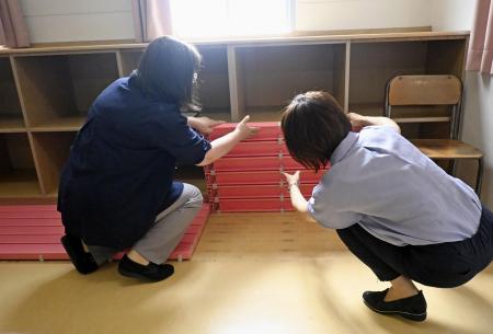 栃木県内の県立高校で女子更衣室内のすのこ裏を点検する教職員=8月