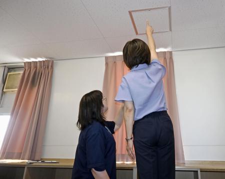 栃木県内の県立高校で女子更衣室の点検口を確認する教職員=8月