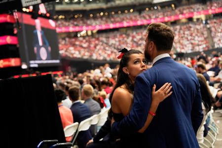 21日、米アリゾナ州グレンデールで行われた保守系活動家チャーリー・カーク氏の追悼式典で、トランプ大統領の演説を聴く参加者ら(AP=共同)