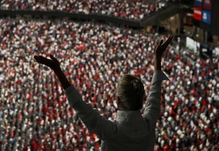 21日、米アリゾナ州グレンデールで行われた保守系活動家チャーリー・カーク氏の追悼式典で両手を上げる参加者(ロイター=共同)