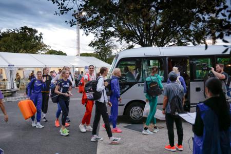 ウオーミングアップのためメインのサブトラックに到着した選手ら=21日午後、東京都渋谷区