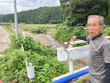 浦上川が氾濫した状況を振り返る竹島忠男さん=9月9日、石川県輪島市門前町の浦上地区