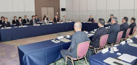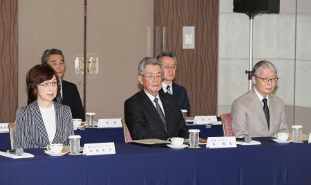 プロ野球オーナー会議に臨むNPBの榊原定征コミッショナー(左)と議長を務める日本ハム・井川伸久オーナーら=17日、東京都内(代表撮影)