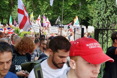 「MEGA」の帽子をかぶって反移民デモに参加する男性(右)=6月28日、ロンドン(共同)