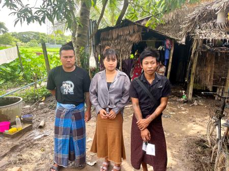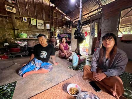 ミャンマーのカンベ村で取材に応じた(左から)チョウチョウさんとモーモーさん、カンコーさん=2025年8月(共同)