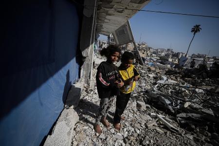 ガザ北部ガザ市で、がれきの中に立つパレスチナ人の子ども=4月16日(ゲッティ=共同)
