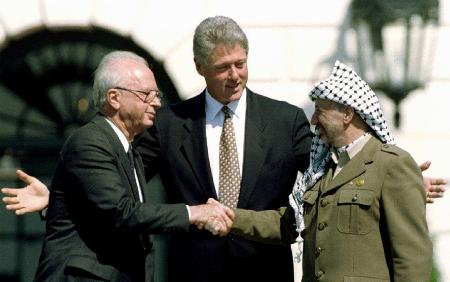 1993年9月、暫定自治宣言の調印式で、握手するイスラエルのラビン首相(左)とPLOのアラファト議長(右)。中央はクリントン米大統領=ワシントン(ロイター=共同)