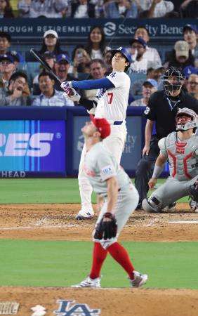 米大リーグのフィリーズ戦で50号ソロを放つドジャース・大谷翔平。50本塁打に2年連続で到達した=16日、ロサンゼルス(共同)