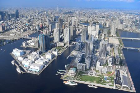 東京都の湾岸エリアに立ち並ぶ高層ビル群=16日午後(共同通信社ヘリから)