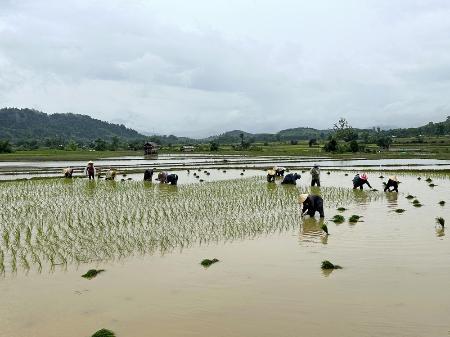ラオス中部ビエンチャン県の村で田植えをする農家