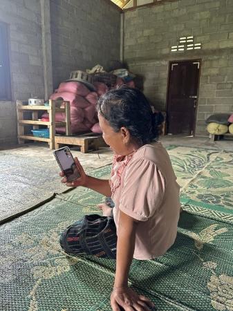 ラオス中部ビエンチャン県の村で中国に嫁いだ娘とビデオ通話するウェンさん