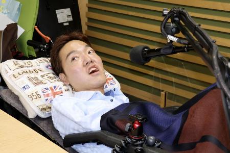 FM番組「寝たきり社長のおはようエール」のパーソナリティーを務める佐藤仙務さん(手前)=5月、名古屋市