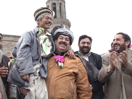 映画「荒野に希望の灯をともす」の一場面。アフガン人と笑顔の中村哲さん(左端)(日本電波ニュース社提供)