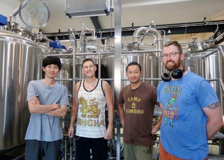 和歌山県有田川町の「ノムクラフト」でクラフトビールを醸造する代表の金子巧さん(左端)。左から3人目は中村準也さん=8月
