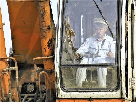 映画「荒野に希望の灯をともす」の一場面。用水路建設のためショベルカーで作業する中村哲さん(日本電波ニュース社提供)