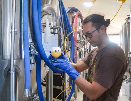 和歌山県有田川町の「ノムクラフト」でクラフトビールを醸造する代表の金子巧さん=8月