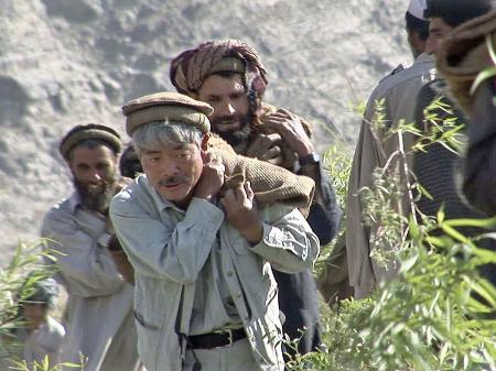 映画「荒野に希望の灯をともす」の一場面。用水路建設のため作業する中村哲さん(日本電波ニュース社提供)