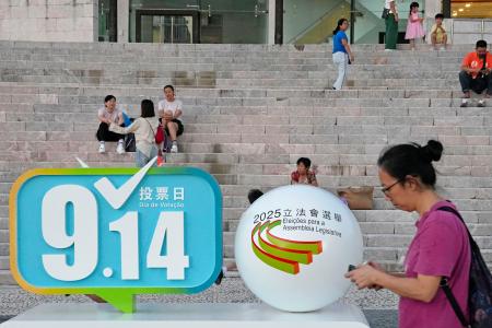 マカオの立法会選挙で投票を呼びかける看板(左上)=12日(共同)