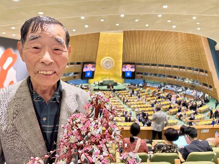米ニューヨークの国連本部で体験を証言した北三郎さん(仮名)。自作の造花も持参した=6月(支援者提供)