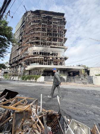 ネパール・カトマンズにある暴徒に放火されたホテル=12日(共同)