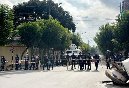 12日、ネパール・カトマンズで警戒に当たる警察官ら(共同)
