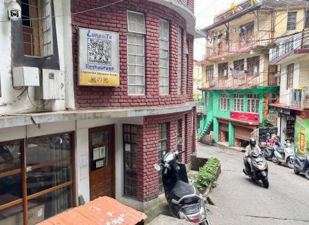 坂道の脇にある日本料理店「ルンタレストラン」=6月、インド・ダラムサラ(共同)
