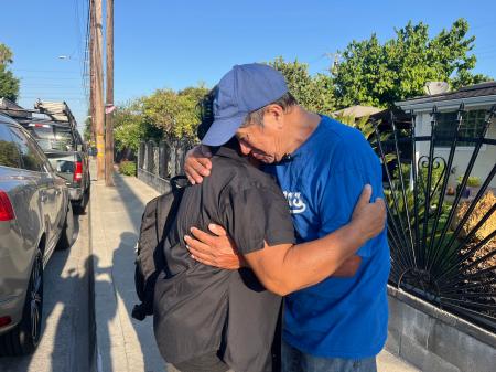米ロサンゼルスで、セルヒオ・エルナンデスさん(右)と抱擁を交わして別れを告げるエレウテリア・カスティジョさん=8月(共同)
