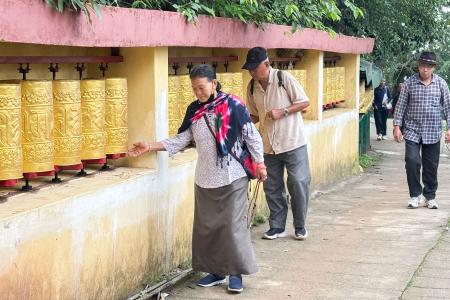 インド・ダラムサラで「マニ車」を回す人=7月(共同)