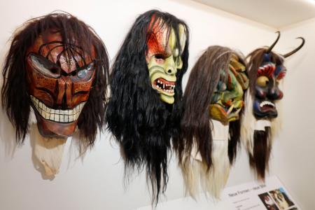 「チャガタ」の仮面。「スパイダーマン」に着想を得た作品(左端)もある=7月、スイス・ブラッテン近郊(共同)