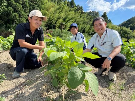 「ノビテク」を使って黒豆を育てる岡田裕樹さん(左)と、パナソニックHDの児島征司さん(右)=7月、兵庫県丹波市