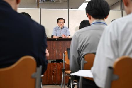 記者会見する高橋正人弁護士=2025年7月、東京地裁