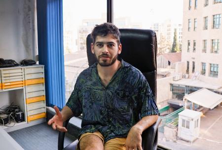 エルサレムで取材に応じるイタマール・シュバルツさん=8月20日(共同)