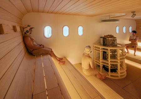 小さな丸窓やシート型のベンチを備えた「飛行機サウナ」(天然温泉こまき楽の湯提供)