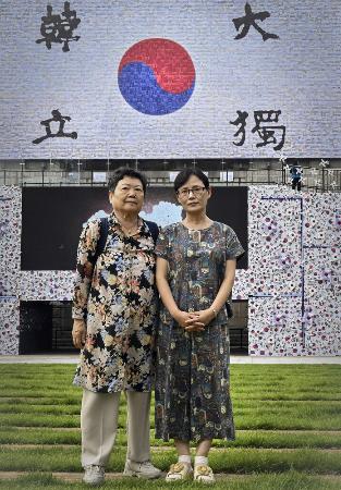 脱北した川崎栄子(左)と李ソラ=韓国・ソウル中心部のソウル広場